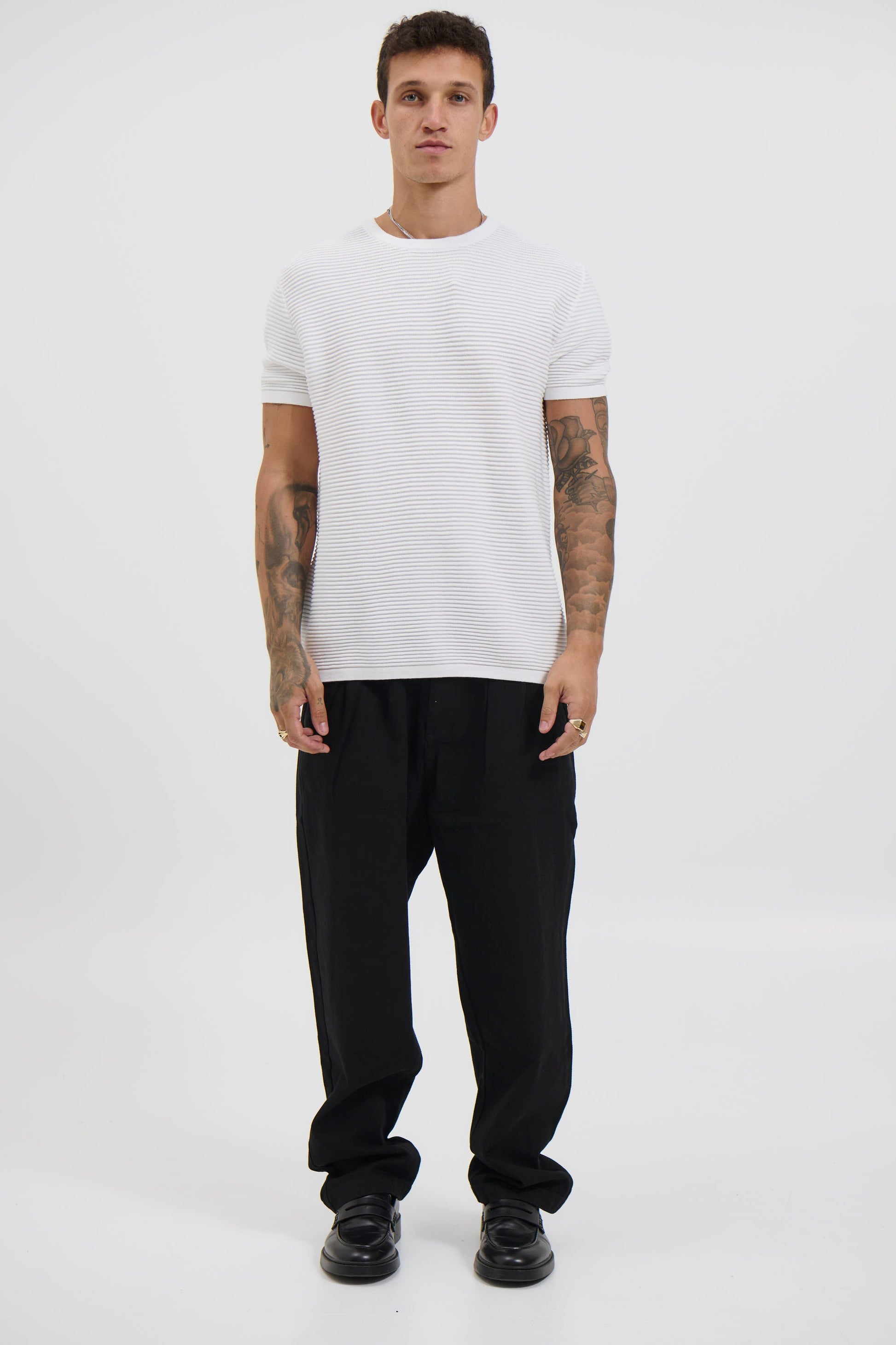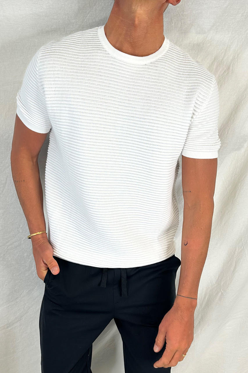 The Horizontal Rib Knit Tee, Slightly cropped and cut for a clean, close-to-body shape, it offers a modern silhouette without sacrificing comfort. The ribbed fabric adds subtle detail and stretch, making it an easy choice for everyday wear or elevated layering.