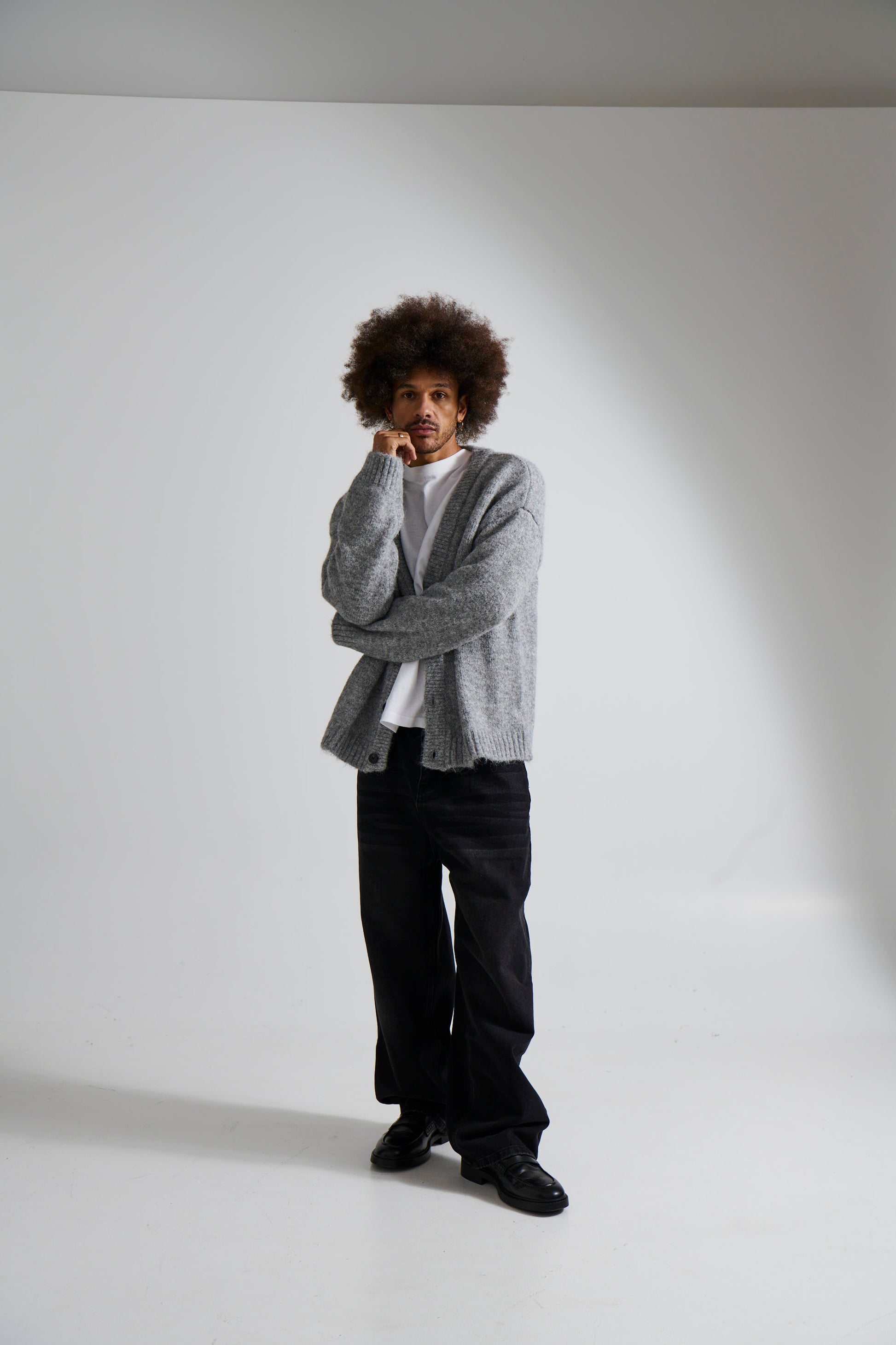 The Knitted Oversize Cardigan, Features a relaxed drop shoulder silhouette for that laid-back feel. The classic button-down front pairs with a clean V-neckline, making it easy to throw over a tee or collared shirt.